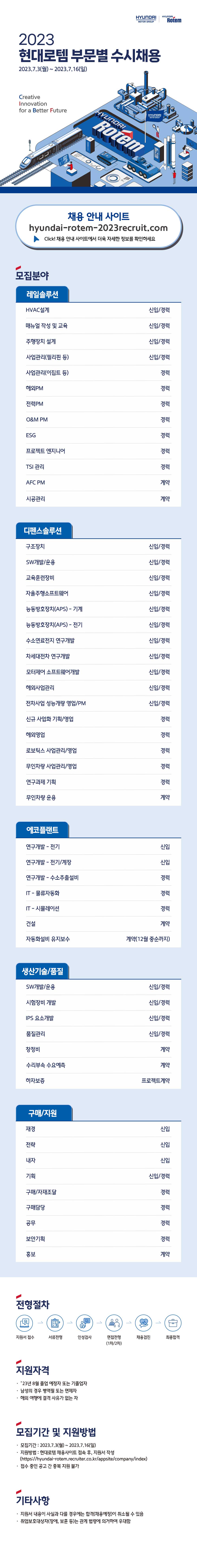 ■ 모집 분야- 레일솔루션 ㅣHVAC설계, 매뉴얼 작성 및 교육, 주행장치 설계, 사업관리(필리핀/이집트 등), 해외PM, 전력PM, O&M PM, ESG, 프로젝트 엔지니어, TSI 관리, AFC PM, 시공관리