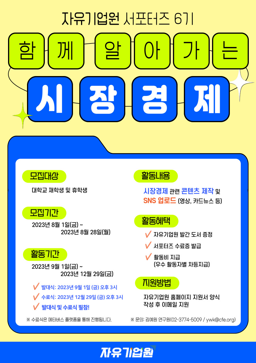 - (문의 및 접수) 김예원 자유기업원 연구원 (ywk@cfe.org, 02-3774-5009)