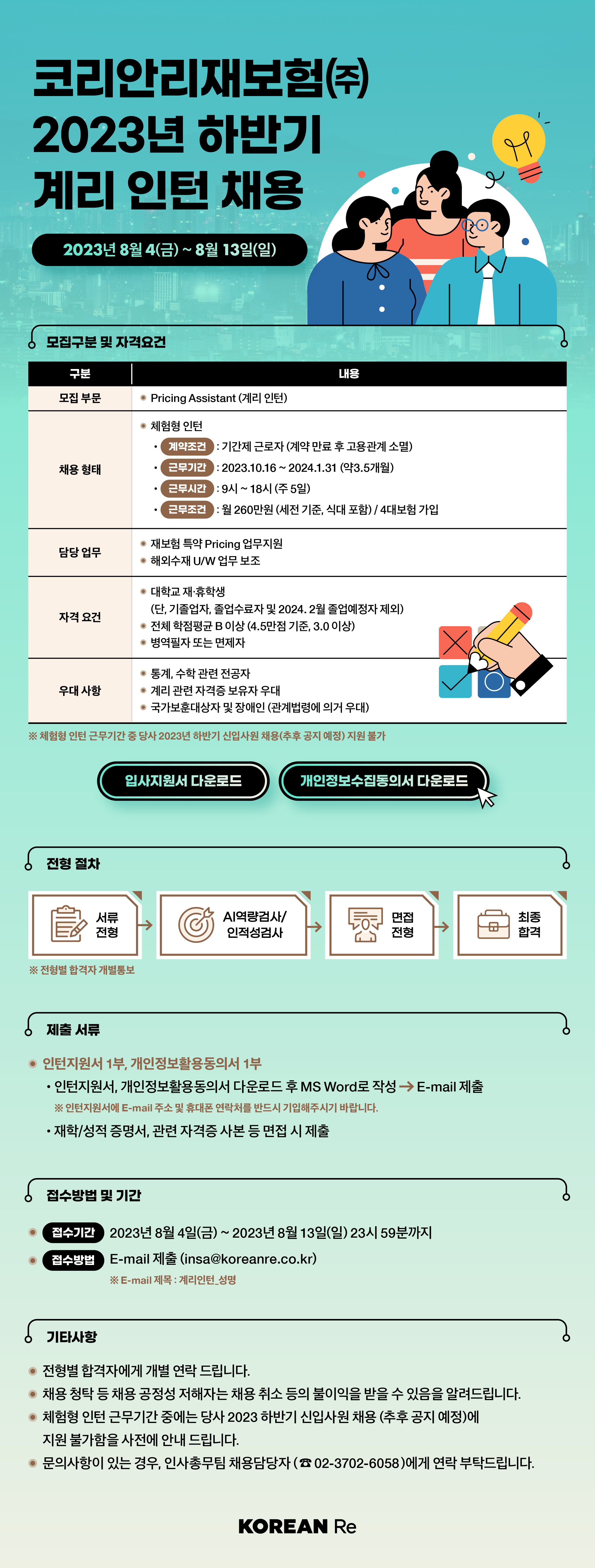 □ 공고 제목: 코리안리재보험㈜ 2023년 하반기 계리 인턴 채용