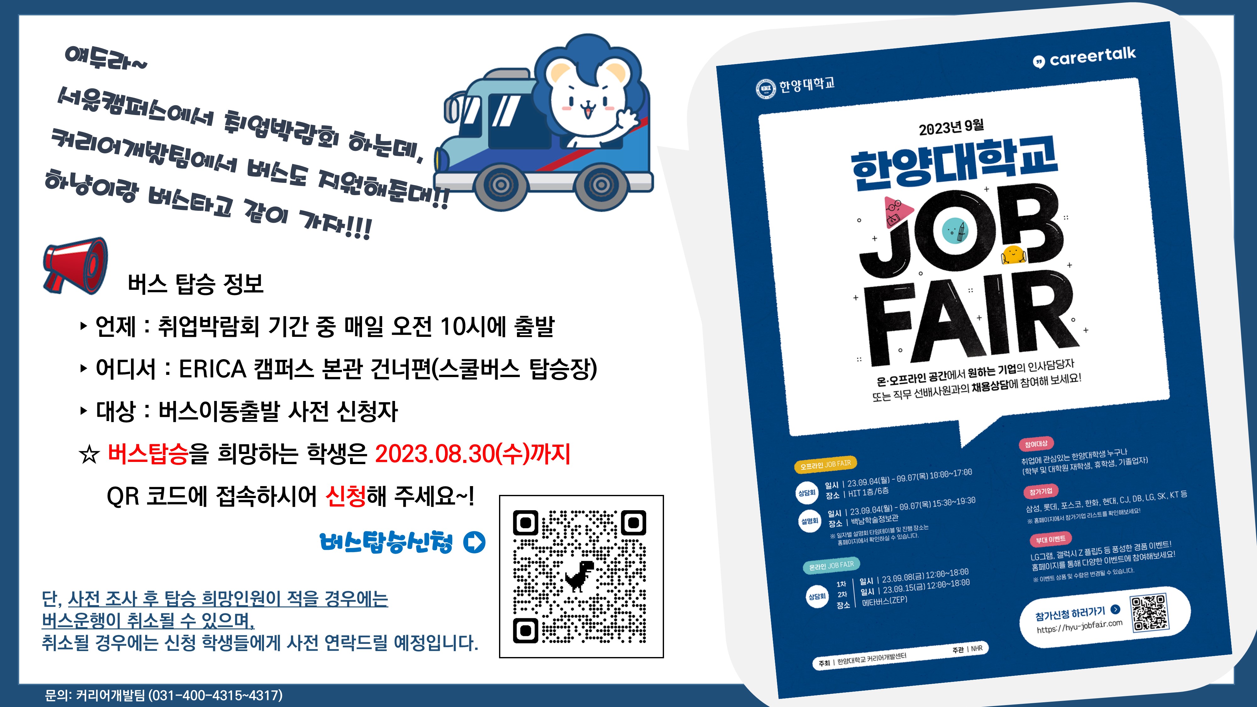 커리어개발팀에서는 2023.09.04(월) ~ 09.07(목) 기간동안 서울캠퍼스에서 진행되는 취업박람회 참가를 희망하는 ERICA 재학생들을 위하여