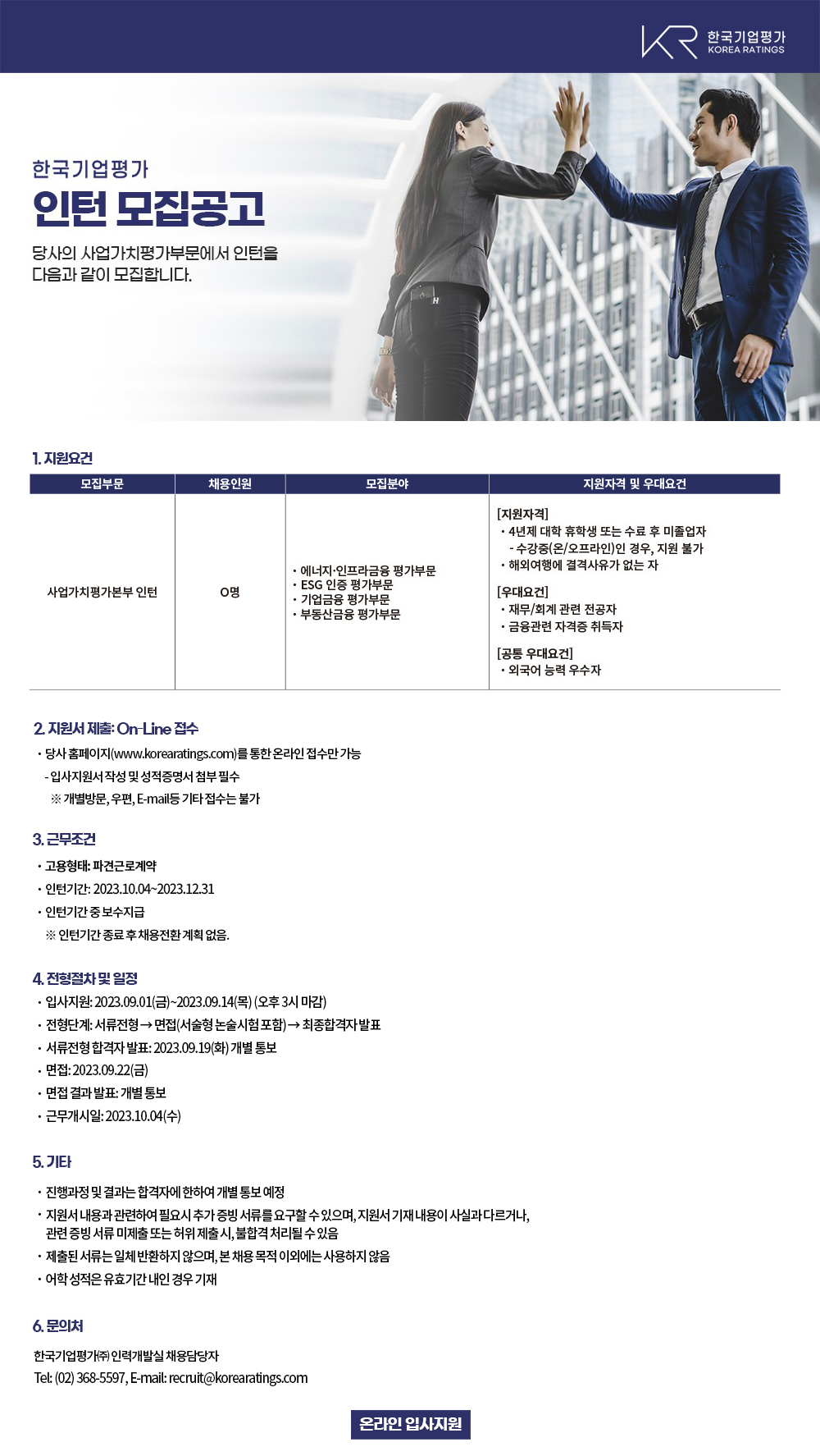[한국기업평가] 한국기업평가 인턴 모집공고 (~9/14 15:00)