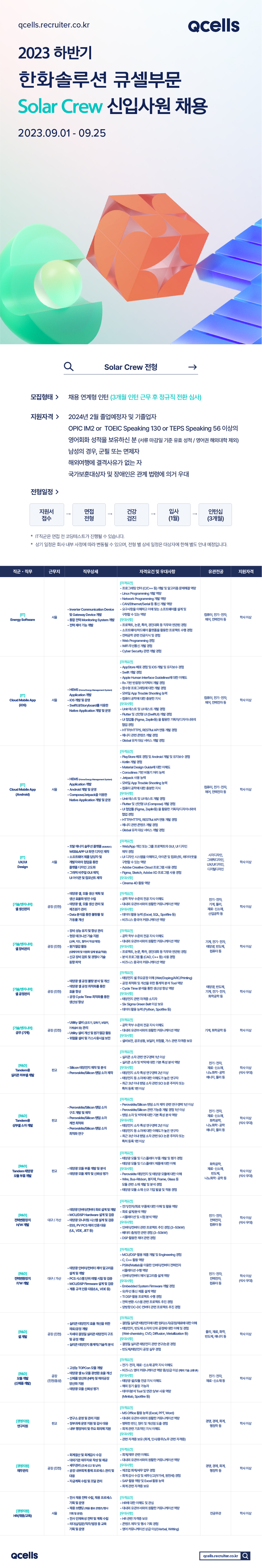 [한화솔루션] 23년 하반기 큐셀부문 Solar Crew 신입사원 채용 (~9/25)