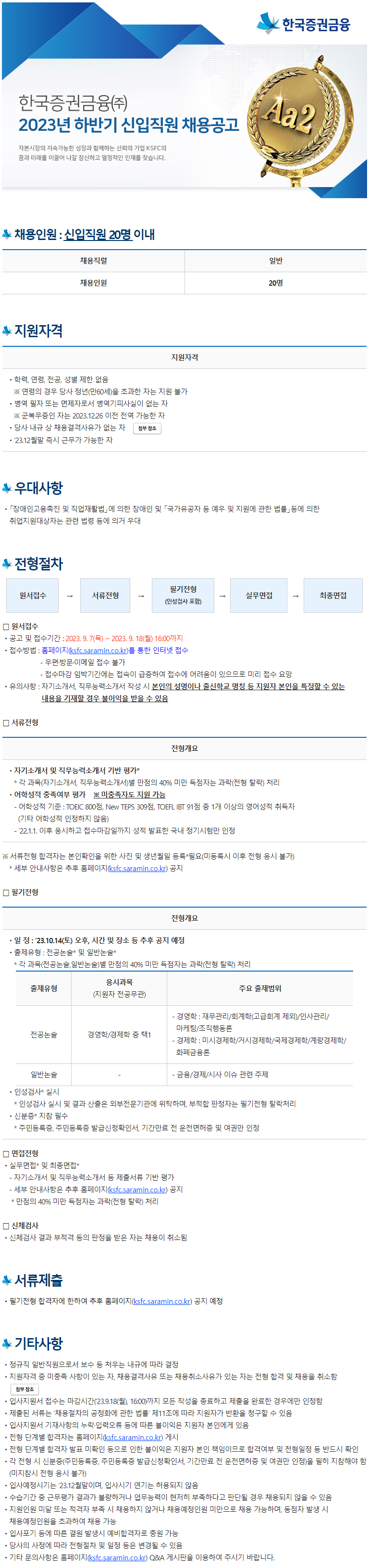 [한국증권금융] 2023년 하반기 신입직원 채용 (~9/18 16:00)