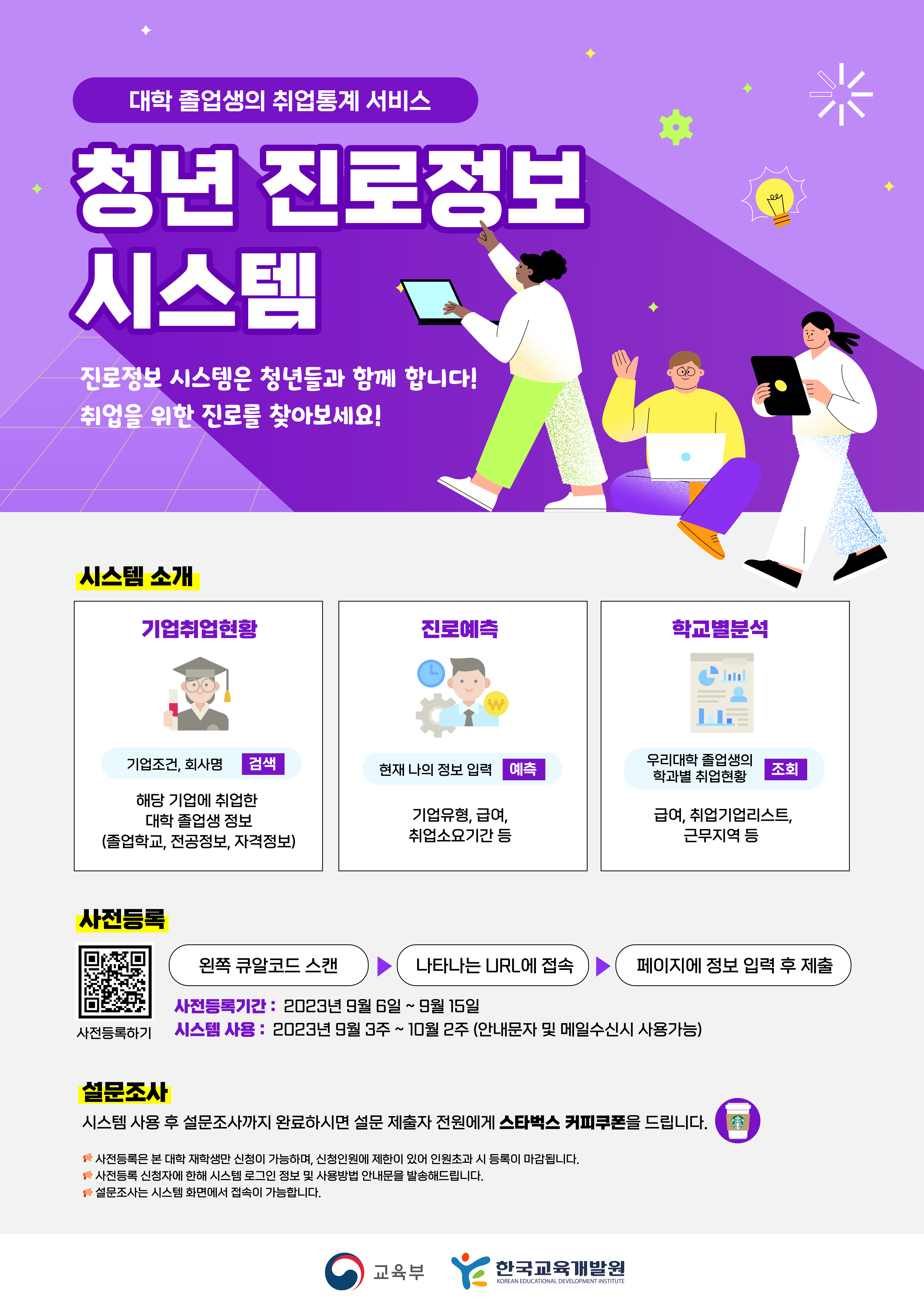 위 사업과 관련하여 우리 대학이 시범 대학으로 선정되어 「청년 진로정보 시스템」을 안내드리오니, 많은 관심과 참여 부탁드리겠습니다.