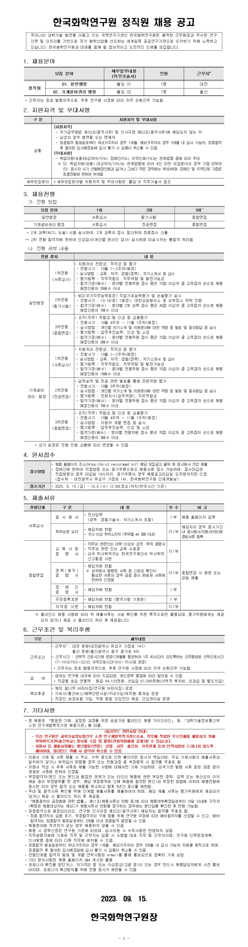 [한국화학연구원] 경영행정분야 정직원 채용 (~10/4 12:00)