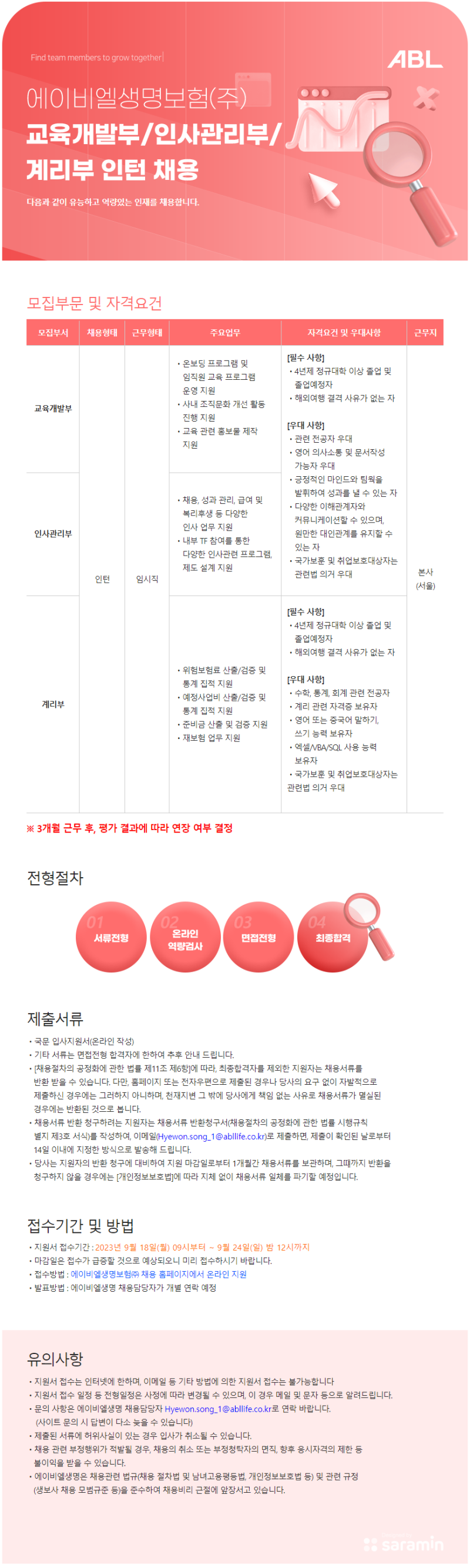 [ABL생명] 교육개발부/인사관리부/계리부 인턴 채용 (~9/24)