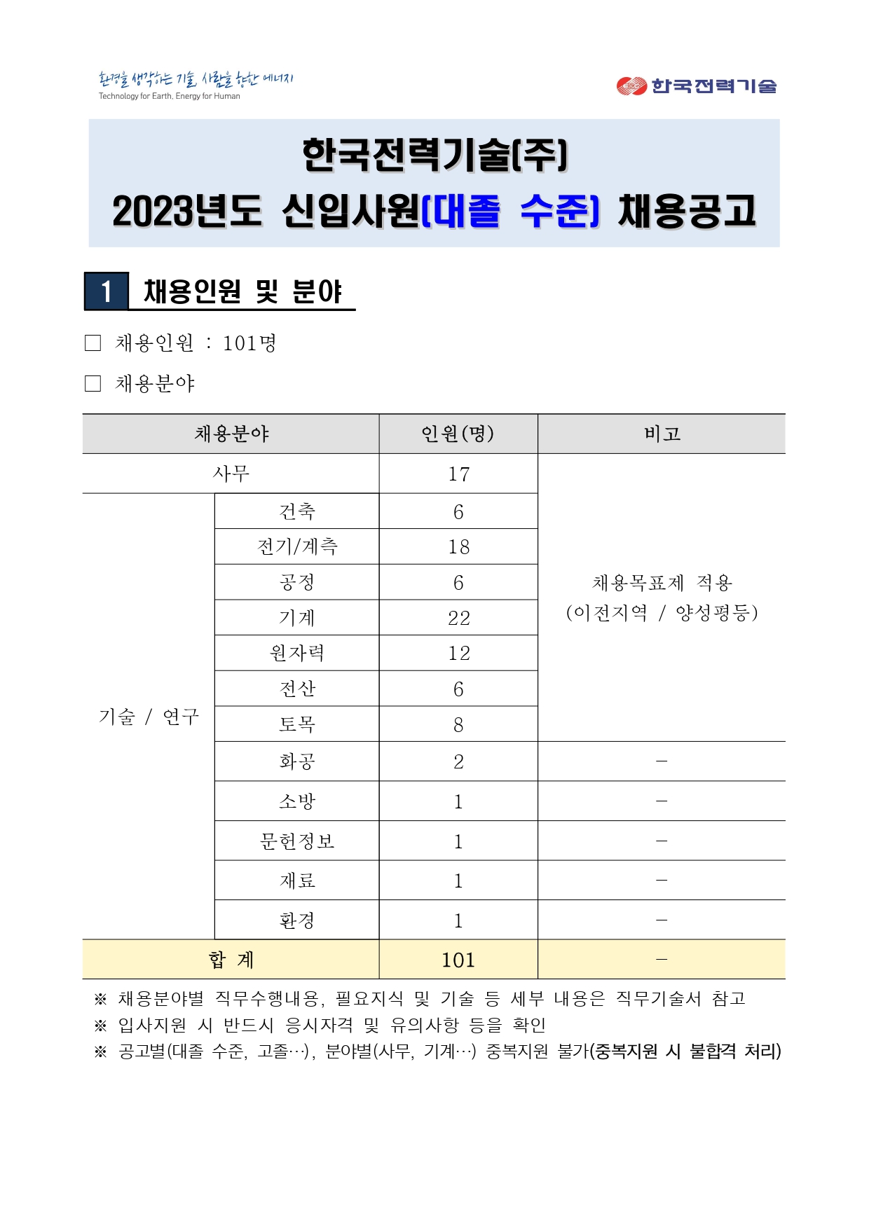 [한국전력기술] 2023년 신입 및 전문인력 채용공고 (~10/11 11:00)