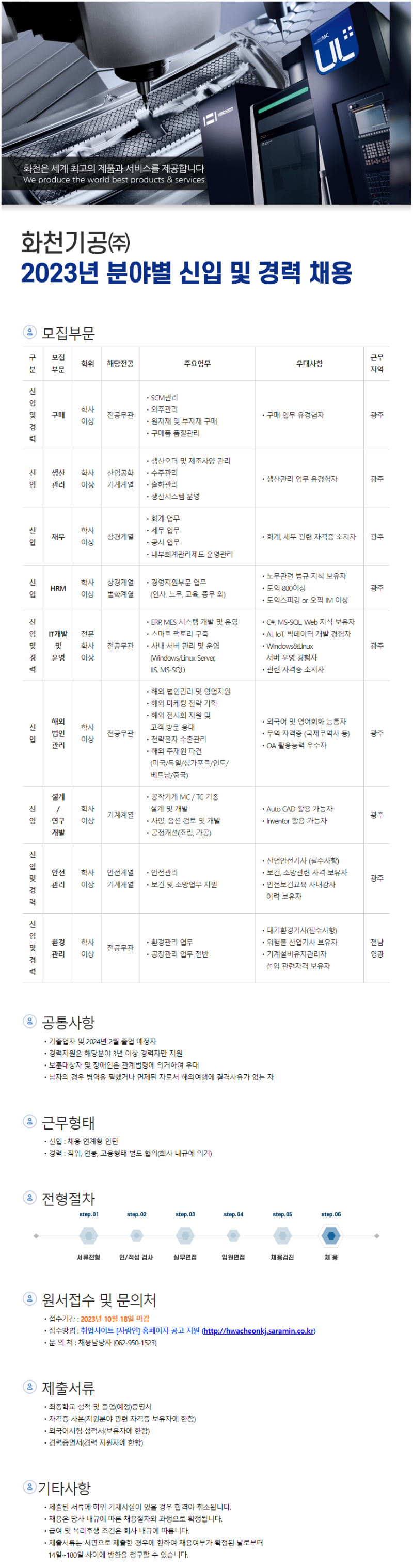 [화천기공] 2023년 분야별 신입 및 경력 채용 (~10/18)