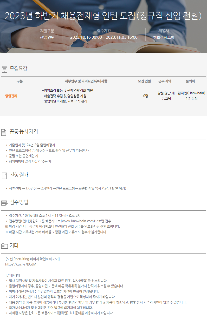 [한화손해보험] 2023년 하반기 채용전제형 인턴 모집 (~11/3 15:00)