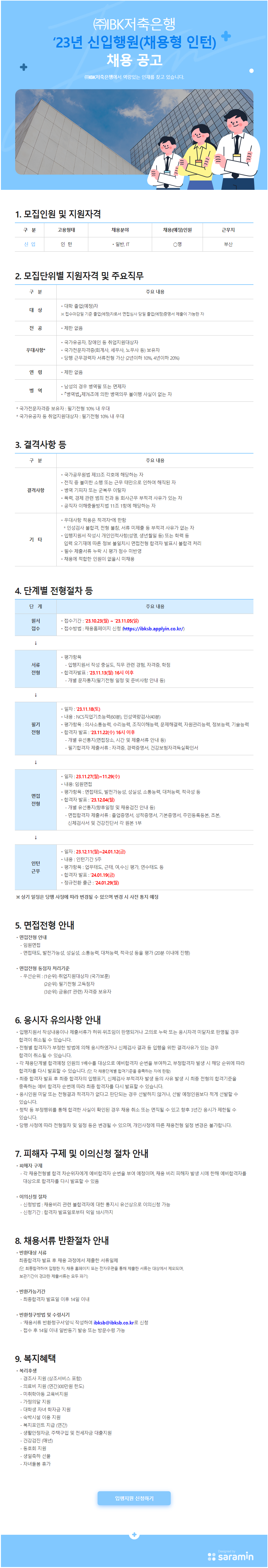 [IBK저축은행] 23년 신입행원 채용형인턴 채용 (~11/5)