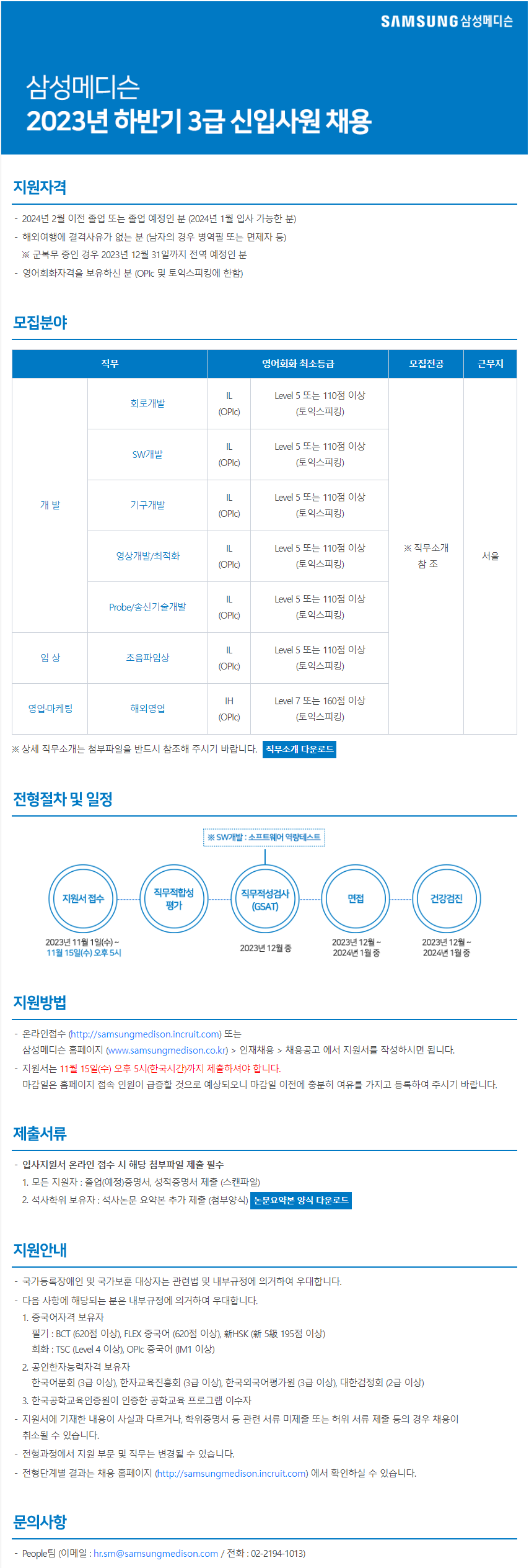 [삼성메디슨] 2023년 하반기 3급 신입사원 채용 (~11/15 17:00)