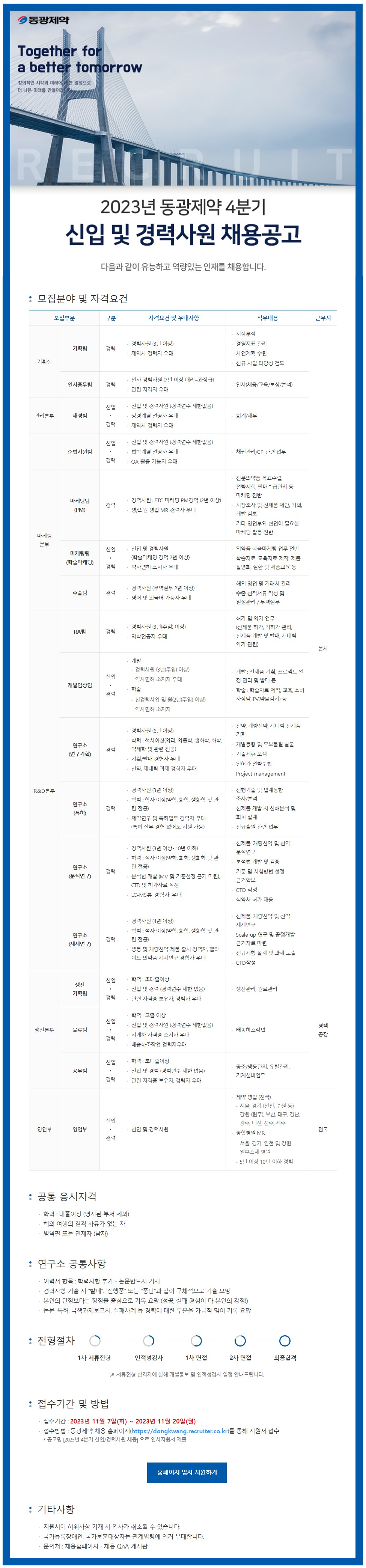 ○ 채용분야 : 재경팀 / 준법지원팀 / 마케팅팀 / 물류팀 / 영업부 등