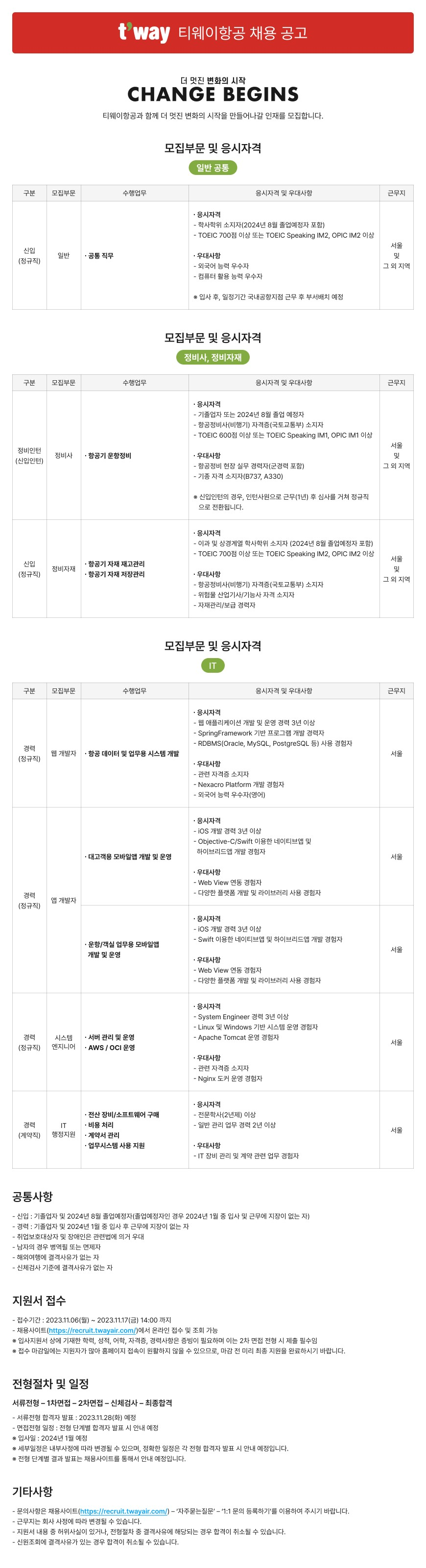 [티웨이항공] 신입(일반/정비) 및 경력(IT) 직원 채용 (~11/17)
