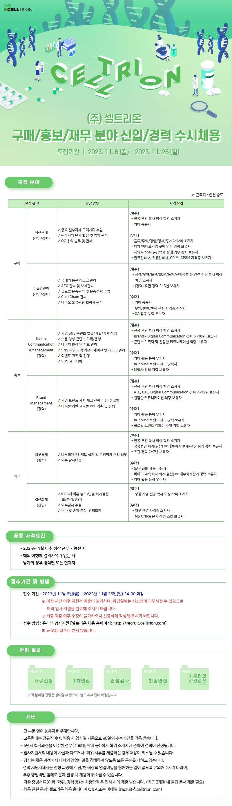 [셀트리온] 구매·홍보·재무 분야 신입/경력 사원 수시채용 (~11/26)