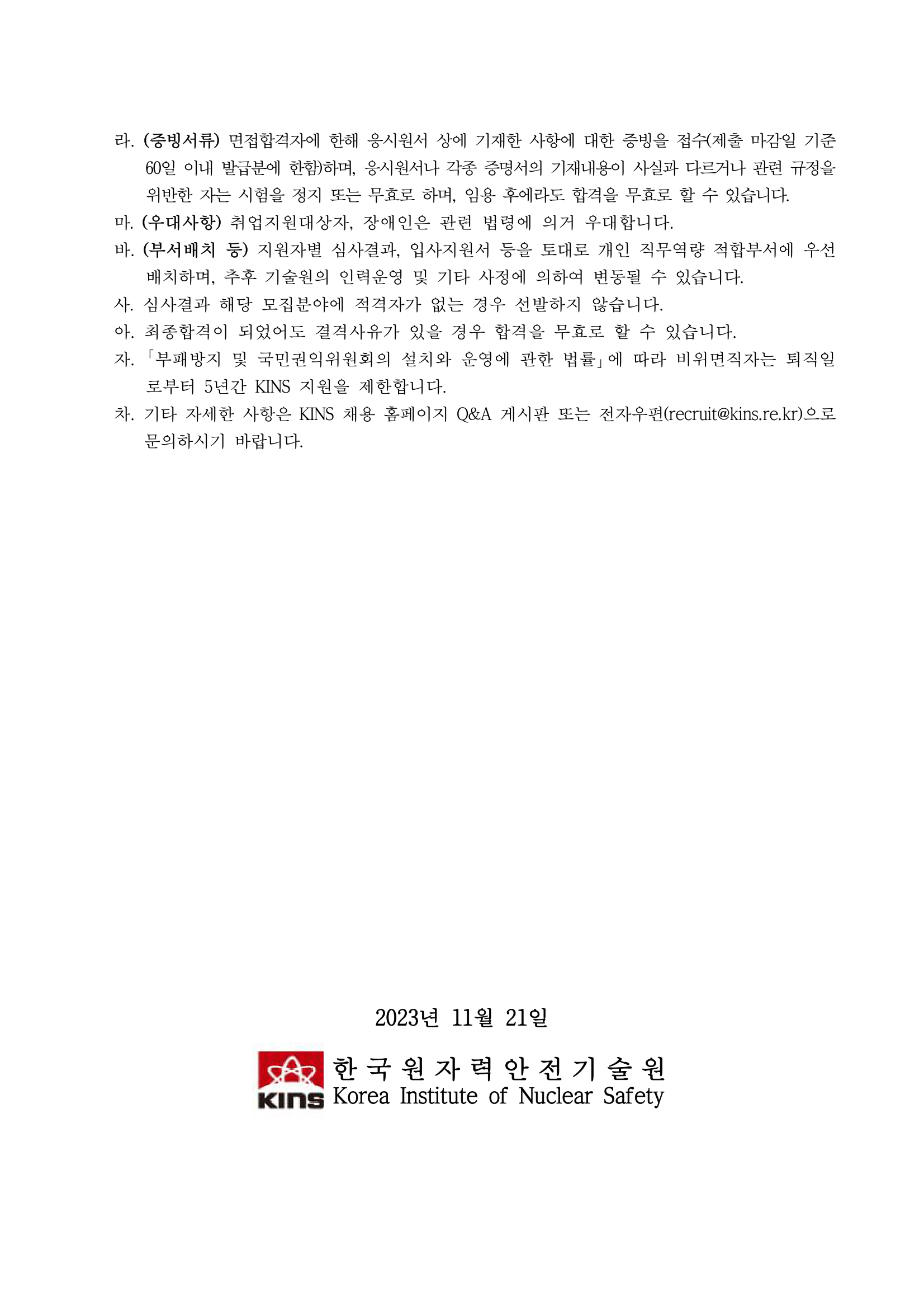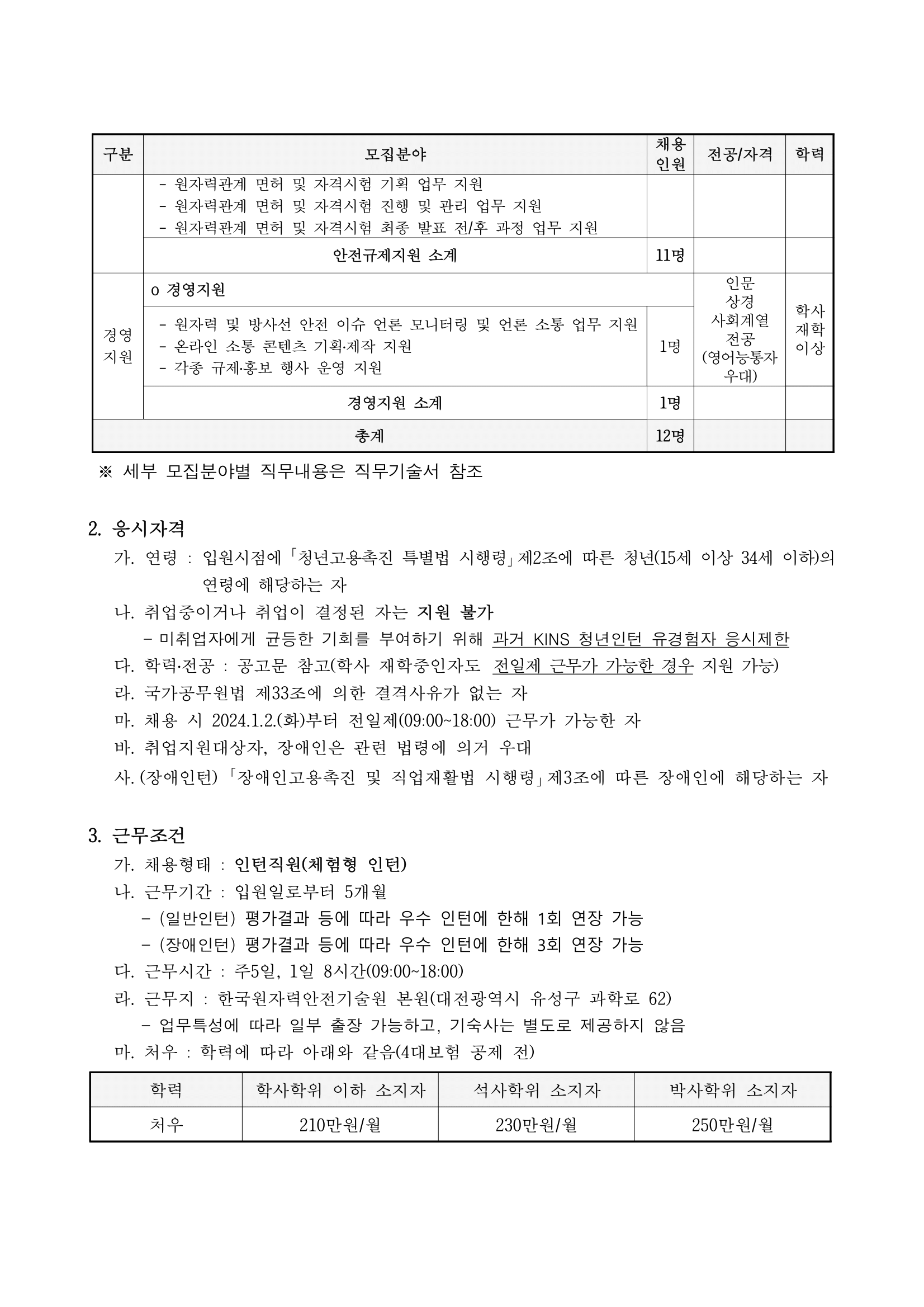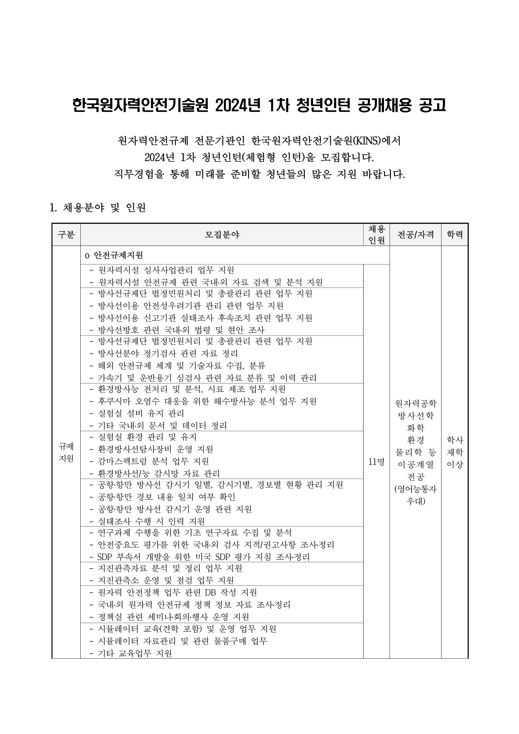 [한국원자력안전기술원] 2024년 1차 청년인턴 공개채용 공고 (~12/6 12:00)