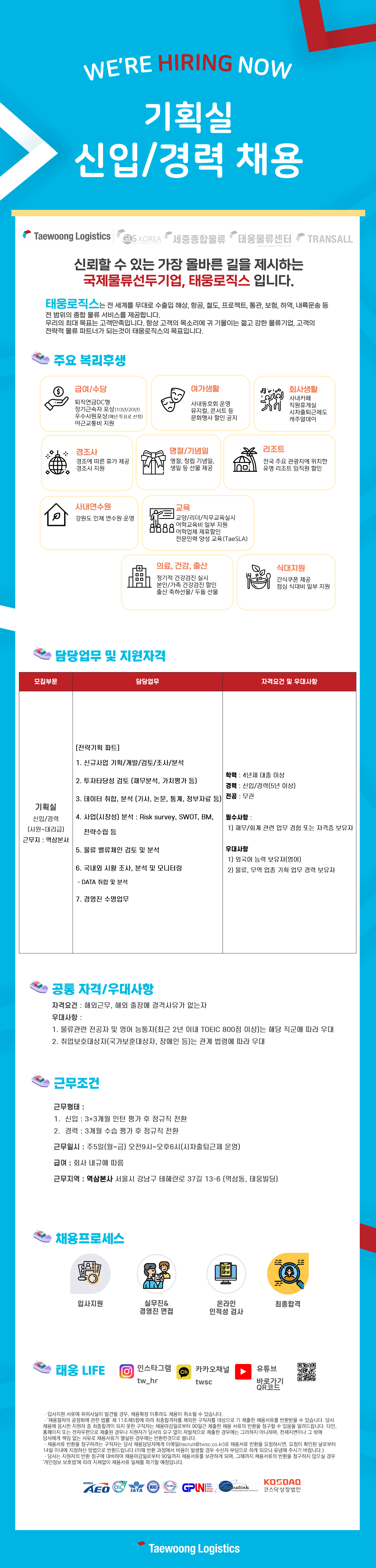 [태웅로직스] 기획실 신입/경력 직원 채용 (~12/15)