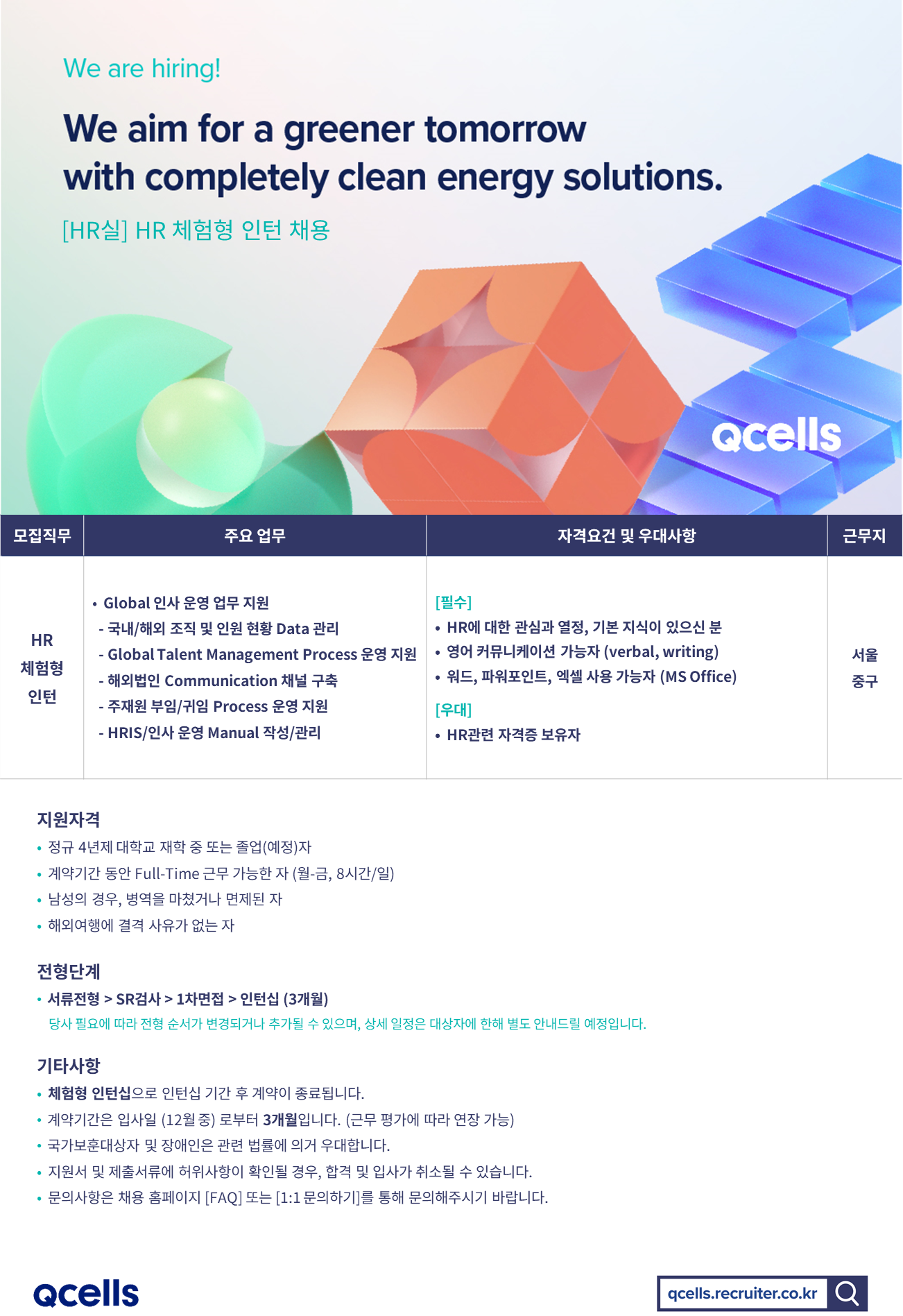 [한화큐셀] HR 체험형 인턴 채용 (~12/4)
