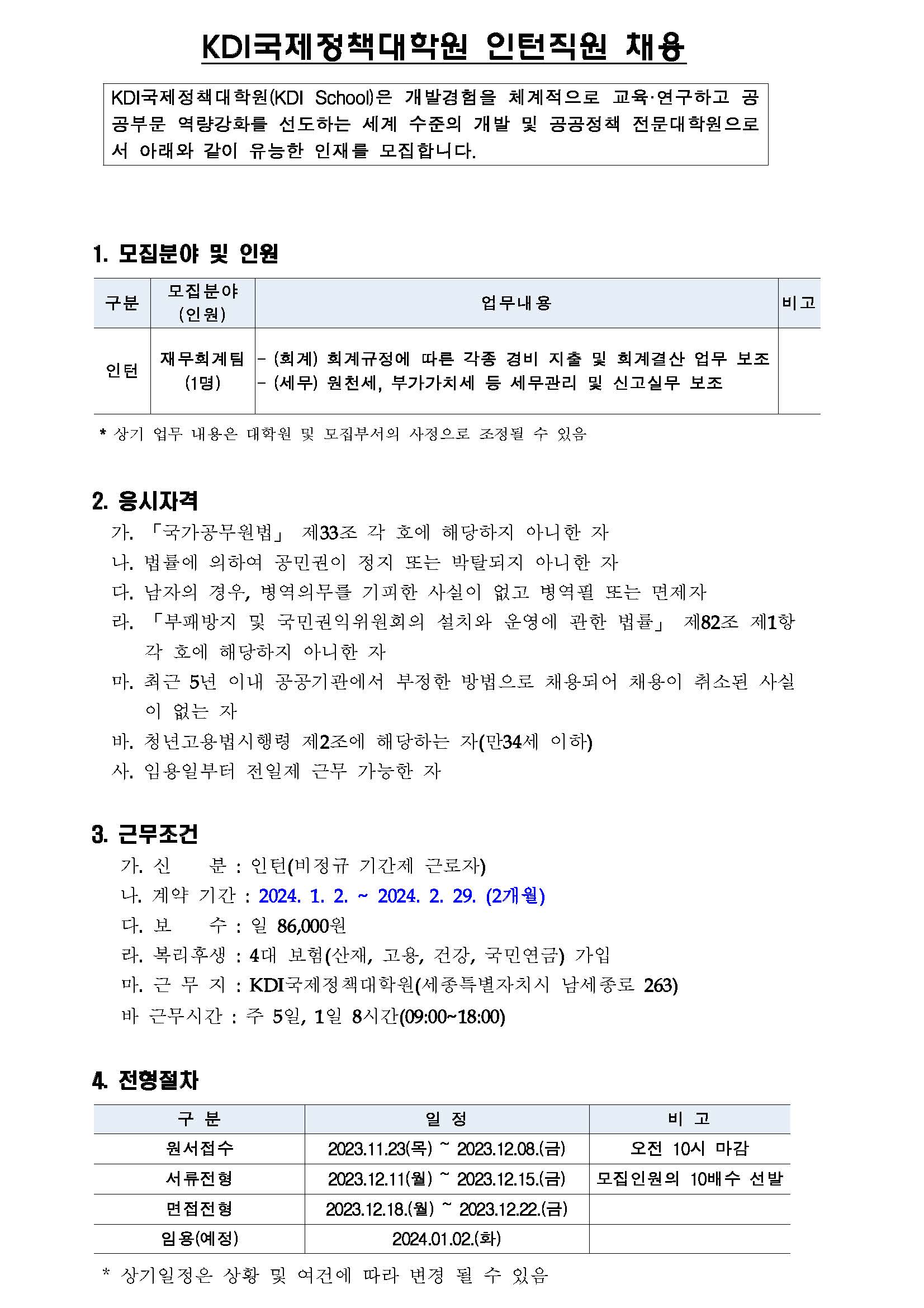 [KDI국제정책대학원] 2024년 제1차 재무회계 인턴 채용 (~12/8 10:00)