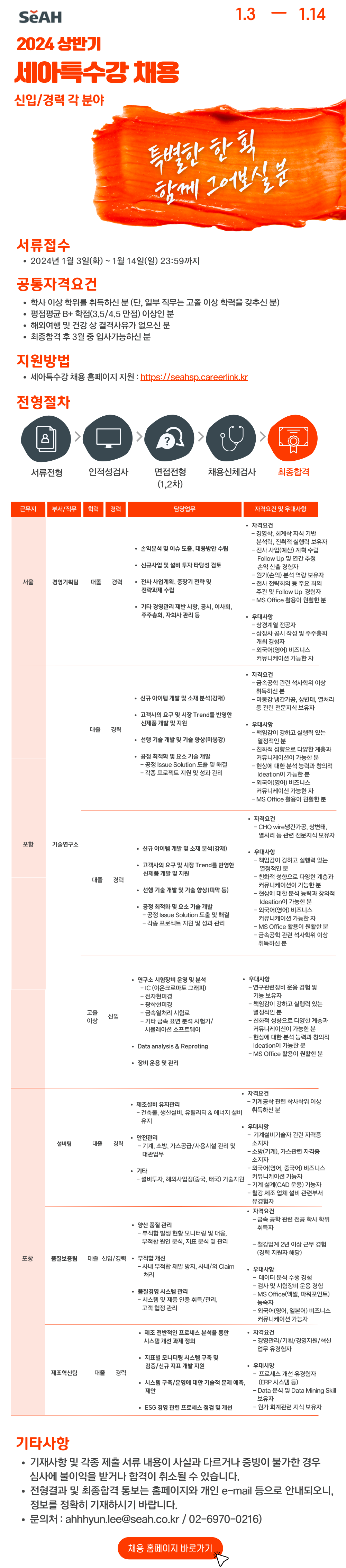 [세아특수강] 2024 상반기 신입/경력 각 분야 채용 (~1/14)