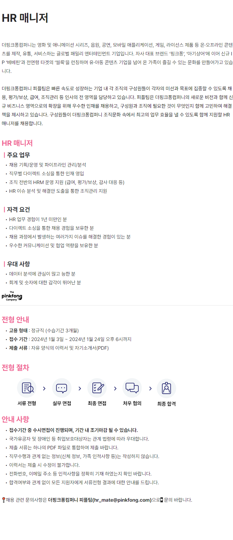 [더핑크퐁컴퍼니] HR 매니저 신입 채용 (~1/24)