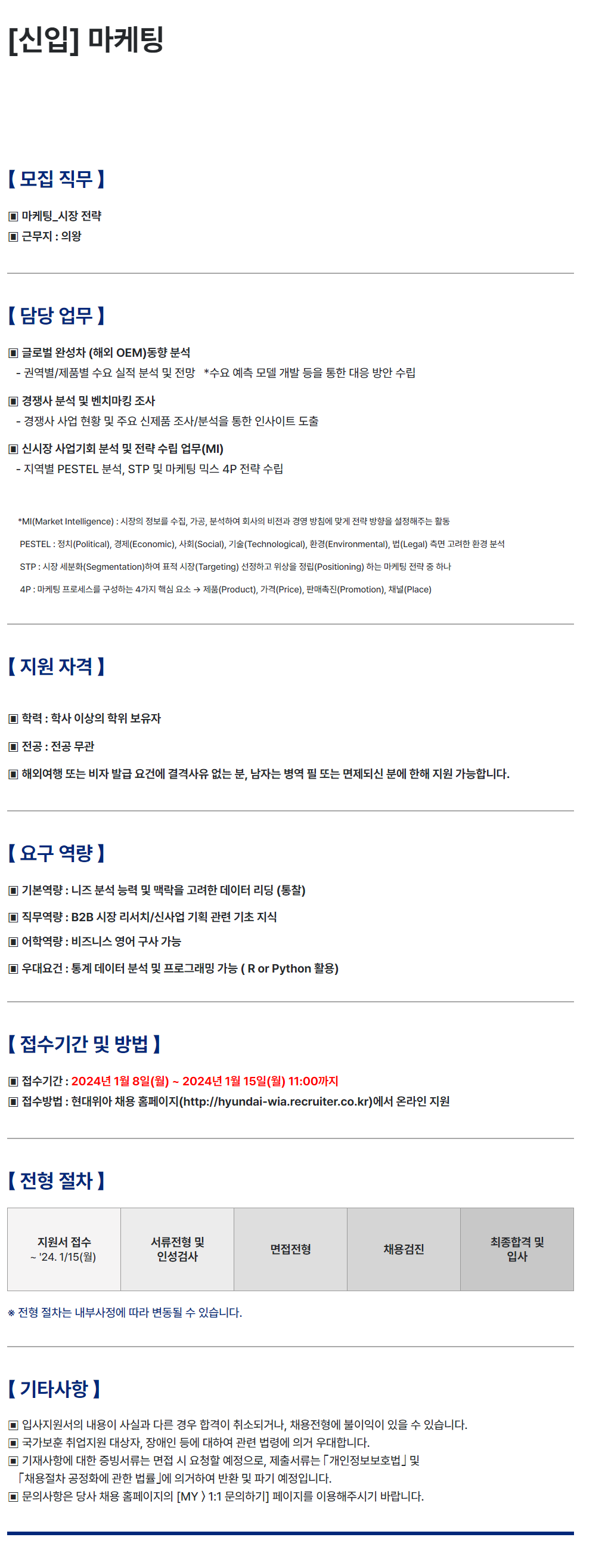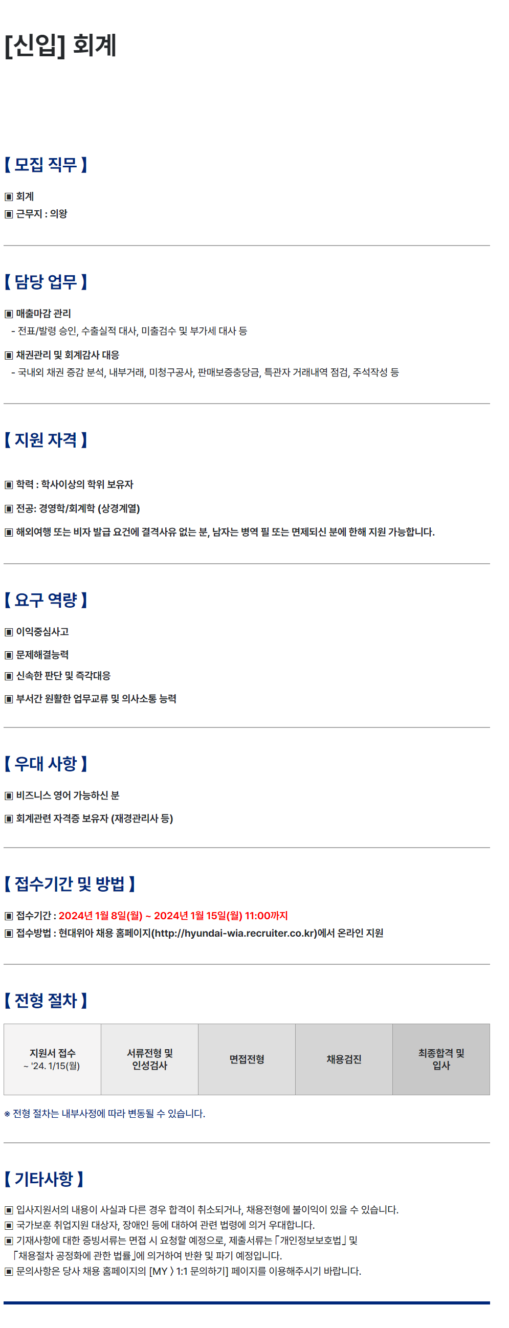 [현대위아] 2024년 대졸 회계/마케팅 신입 채용 (~1/15 11:00)