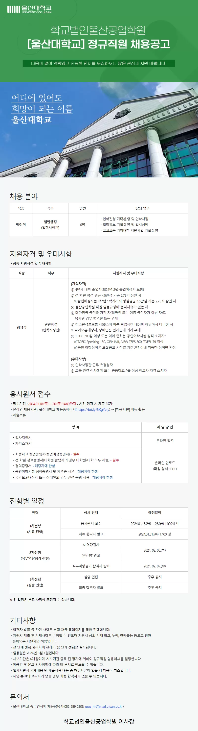 [울산대학교] 2024학년도 정규직원 채용공고 (~1/26 14:00)