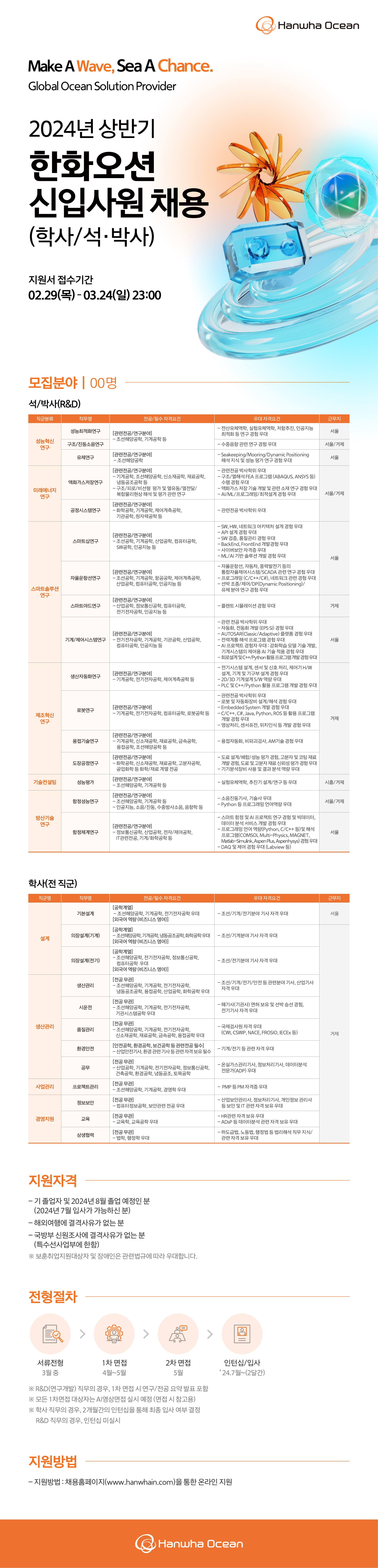 [한화오션] 2024년 상반기 신입사원 채용 (~3.24.)