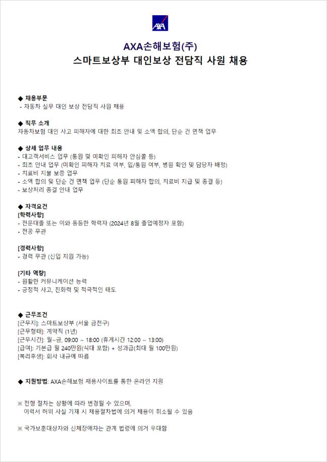 AXA손해보험 채용사이트 지원서 작성 주소: https://axa.recruiter.co.kr/app/jobnotice/view?systemKindCode=MRS2&jobnoticeSn=182797