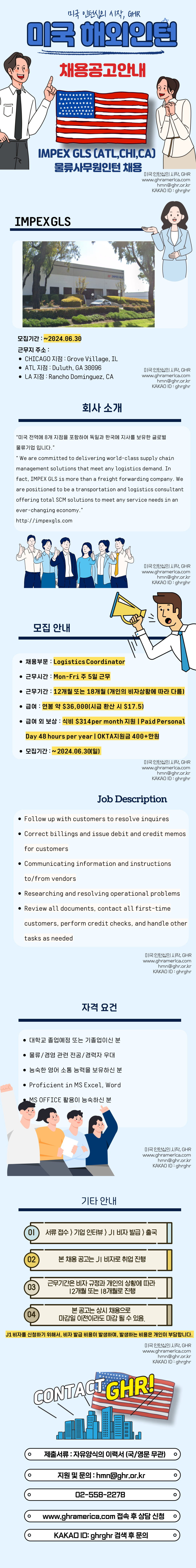 [미국인턴] IMPEX-GLS 물류사원 ATL, CHI, LA 지점 인턴 채용(~6/30)