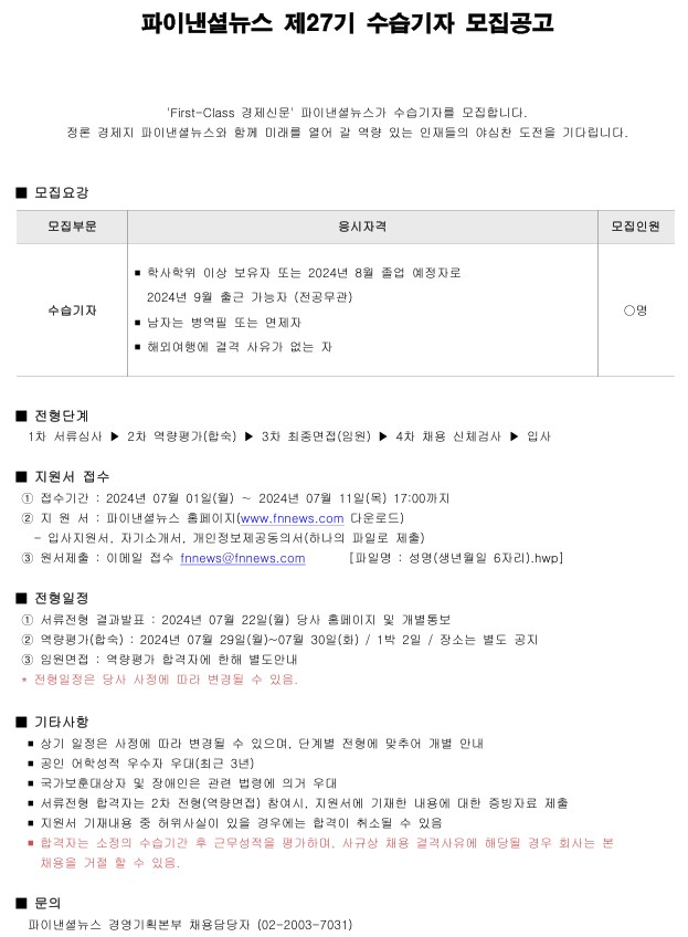 [파이낸셜뉴스] 공채 27기 수습기자 모집요강(~7/11)
