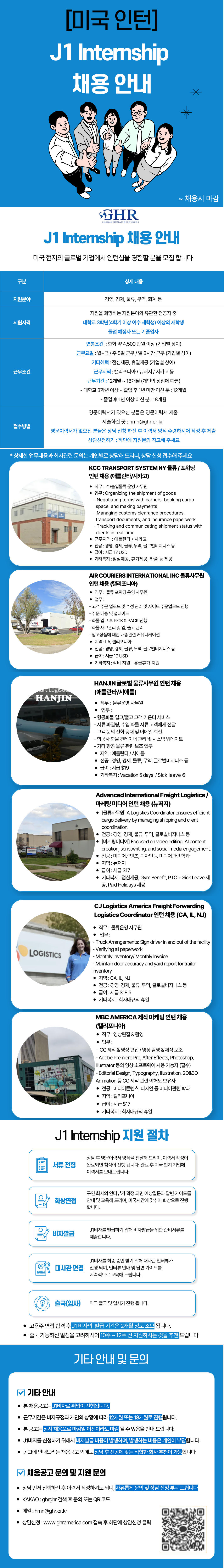 [미국인턴] 미국 J1 Internship 물류, 미디어 (KCC, ACI, HANJIN, AIF, CJ, MBC AMERICA) 채용 (~2/28)