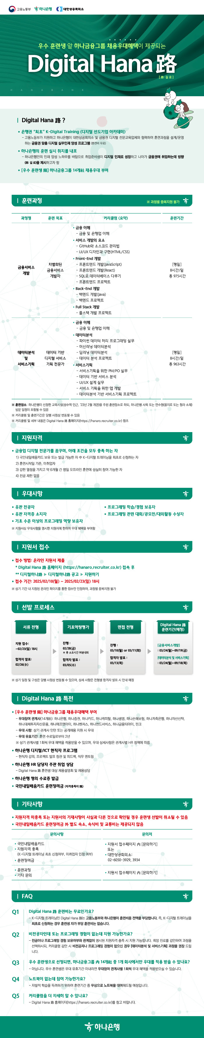 (하나은행) K-Digital Training 디지털하나로 모집 우수 훈련생 앞 하나금융그룹 채용우대혜택이 제공되는 Digital Hana 路 ◆ 지원 기간 | 2025.02.10(월) - 2025.02.23(일) 18시까지 ◆ 지원방법 | 온라인 지원서 제출 * Digital Hana 路 홈페이지 (https://hanaro.recruiter.co.kr) > 디지털하나路 > 디지털하나路 공고 > 지원하기 ◆ 선발 프로세스 | - 서류 전형 : ~ 02.23(일) 18:00 - 기초역량평가 : 02.28(금) * 총 소유시간 90분 내외 - 면접 전형 : 03.10(월) or 03.11(화) - 최종 합격자 발표 : 03.13(목) ※ 상기 일정 및 구성은 당행 사정상 변동될 수 있으며 상세 사항은 전형별 합격자 발표 시 안내 예정 ◆ 훈련과정 | 금융서비스 개발, 데이터 분석 및 서비스 기획 ◆ 훈련기간 | 금융서비스 개발, 데이터 분석 및 서비스 기획 - 금융서비스 개발 : 25.03.24(월) - 25.09.19(금) - 데이터 분석 및 서비스 기획 : 25.03.24(월) - 25.09.18(목) ◆ 지원자격 | 금융업 디지털 전문가를 꿈꾸며, 아래 조건을 모두 충족 하는 자 1) 국민내일배움카드 보유 또는 발급 가능한 자 中 K-디지털 트레이닝을 최초로 신청하는 자 2) 훈련시작일 기준, 미취업자 3) 강한 열정을 가지고 약 6개월 간 평일 오프라인 훈련에 성실히 참여 가능한 자 4) 전공 제한 없음 ◆ 우대사항 | - 유관 전공자 - 유관 자격증 소지자 - 기초 수준 이상의 프로그래밍 역량 보유자 - 프로그래밍 학습/경험 보유자 - 프로그래밍 관련 대회/공모전/대외활동 수상자 ※ 지원서상 우대사항을 명시한 지원자에 한하여 우대 혜택을 부여함 ◆ 혜택 | - 우수 훈련생, 하나금융그룹 14개사 채용우대혜택 부여 - 하나은행 디지털/ICT 현직자 프로그램 - 하나은행 HR담당자 주관 취업 상담 - 하나은행 명의 수료증 발급 - 국민내일배움카드 훈련장려금 |