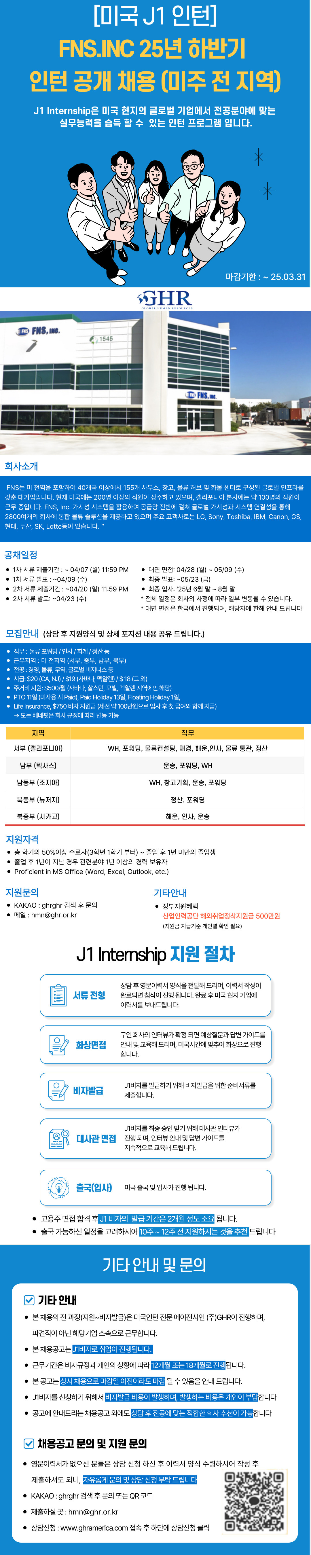[GHR] 미국 J1 인턴 FNS. INC 25년 하반기 인턴 채용 (물류, 회계, 인사) 채용 공고 (~2025.03.31) Hit 784