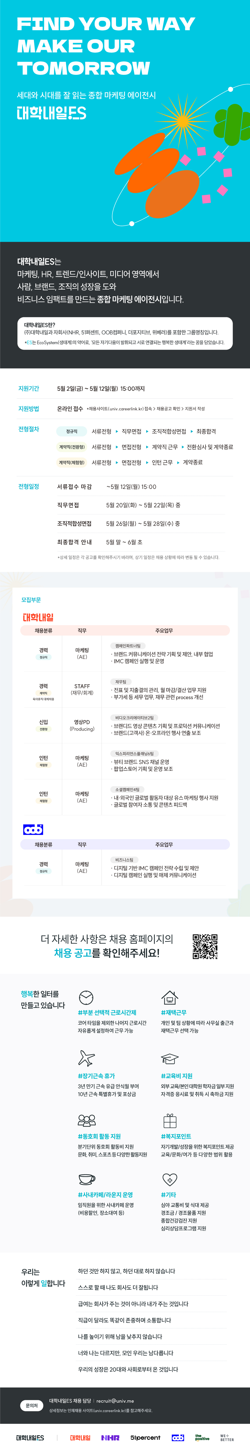 종합 마케팅 에이전시 대학내일ES에서 마케팅(AE) 및 영상PD 인턴/신입 채용을 진행하고 있습니다.