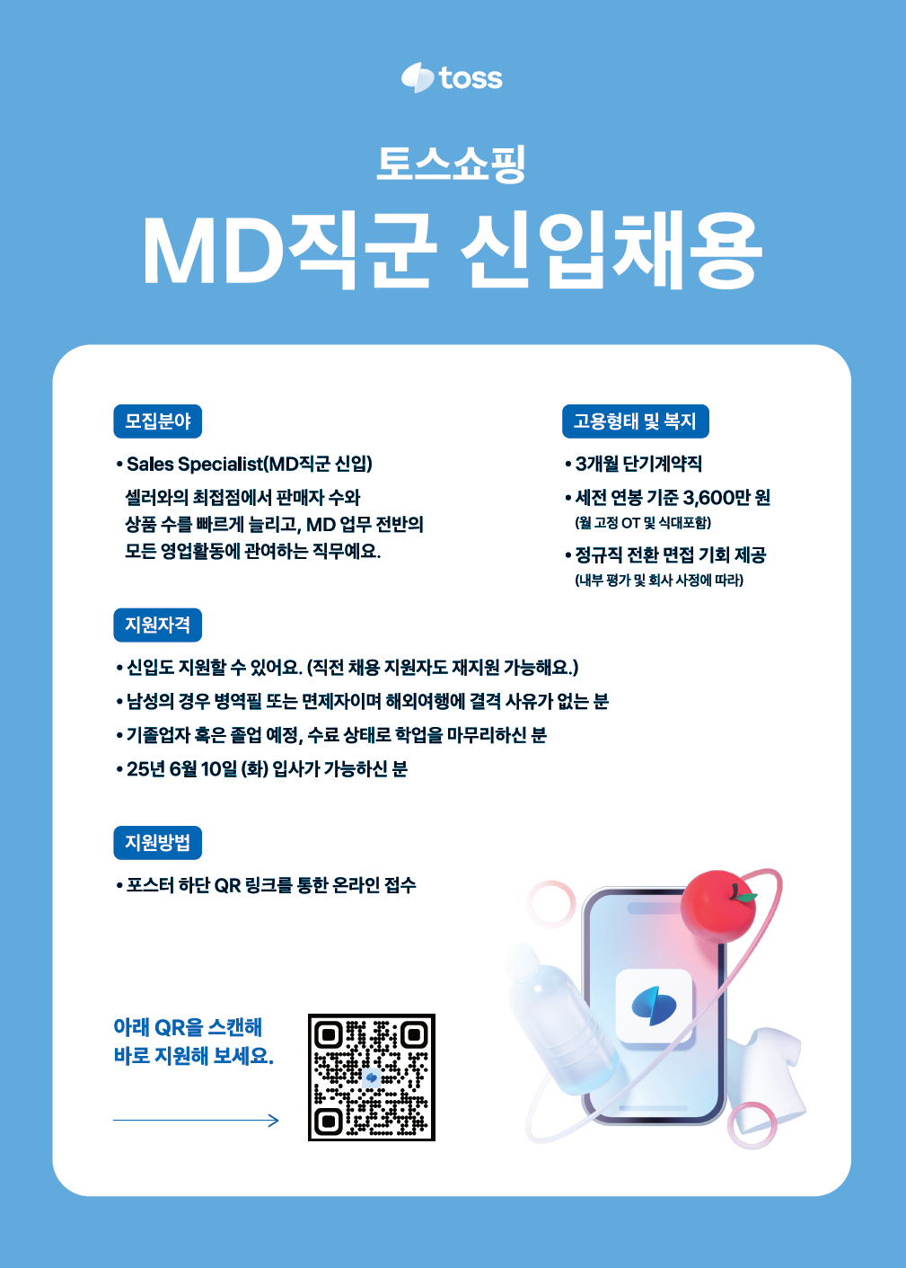토스쇼핑 6월 입사자 Sales Specialist(MD직군 신입) 대규모 채용(~5/19)