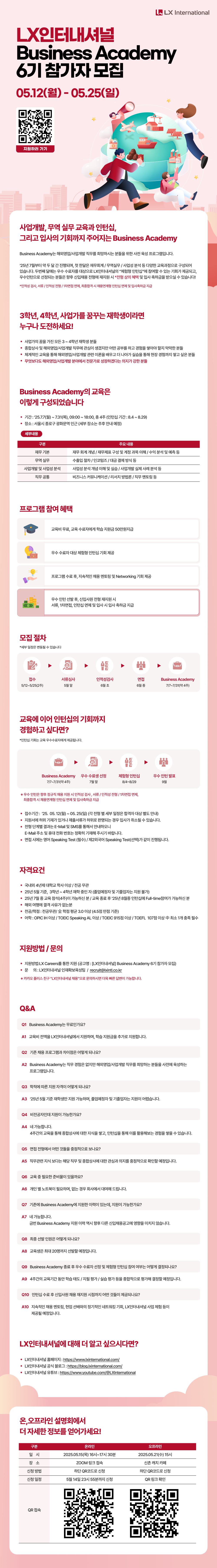 (공고명 : [LX인터내셔널] Business Academy 6기 참가자 모집) - 지원하기 : https://apply.lxcareers.com/app/job/RetrieveJobNotices.rpi?requestMenuId=1075