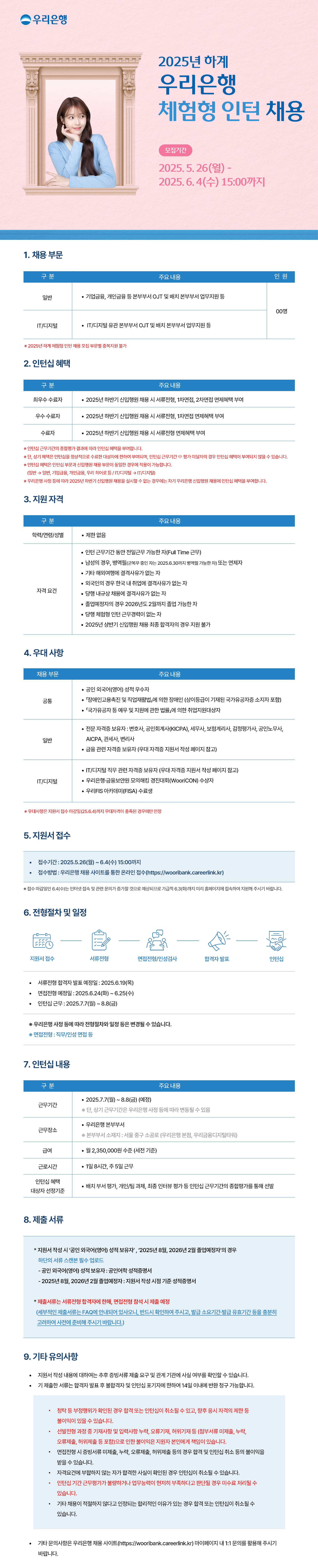2025년 우리은행 하계 체험형 인턴 채용 (6/4 15시까지)