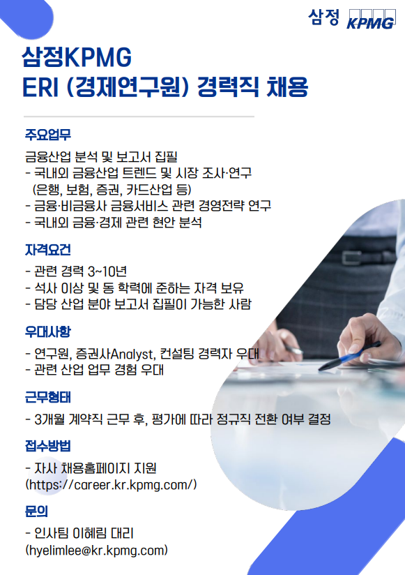 금융산업 분석 및 보고서 집필- 국내외 금융산업 트렌드 및 시장 조사·연구 (은행, 보험, 증권, 카드산업 등)- 금융·비금융사 금융서비스 관련 경영전략 연구- 국내외 금융·경제 관련 현안 분석