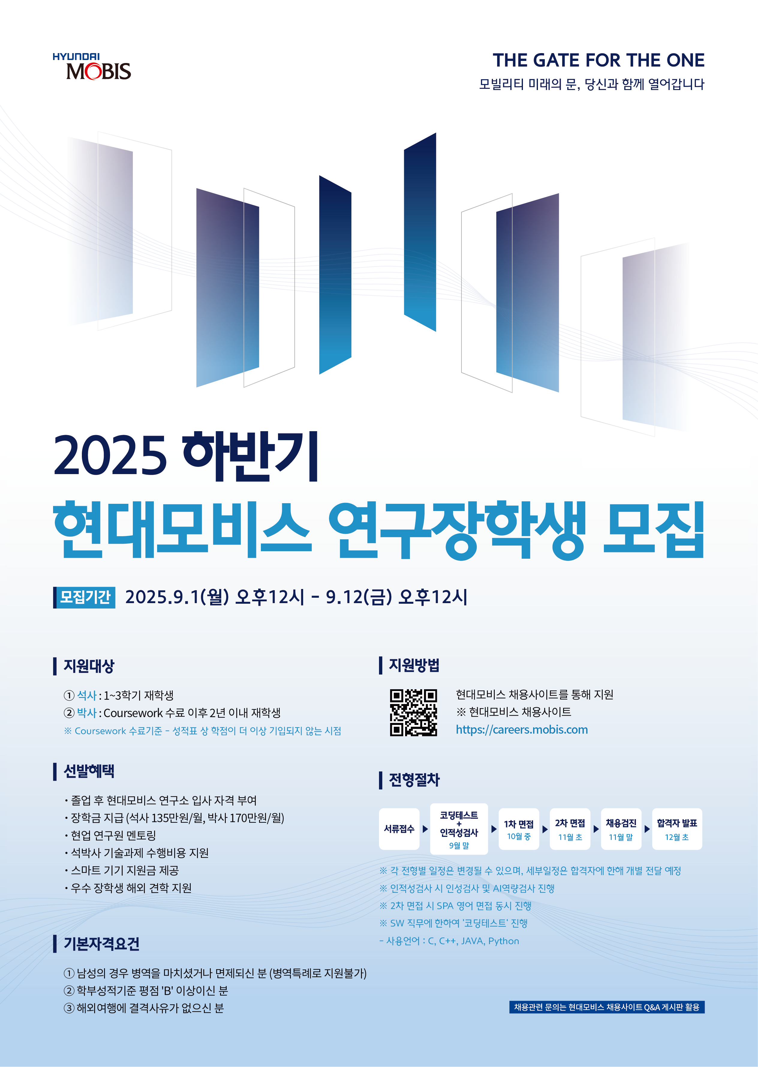 현대모비스와 함께 모빌리티의 미래를 두 손으로 직접 열어갈 석/박사 인재 여러분의 많은 관심과 지원 바랍니다.