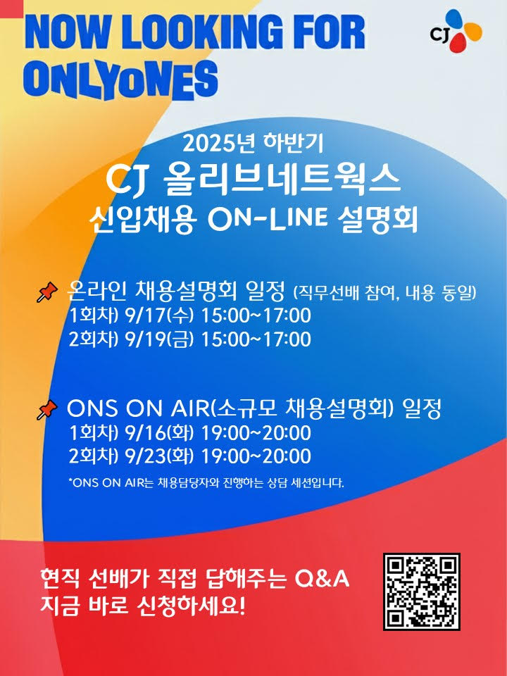 - 2회차: 9월 23일(화) 19:00~20:00(*ONS ON AIR는 채용담당자와 진행하는 상담 세션입니다.)