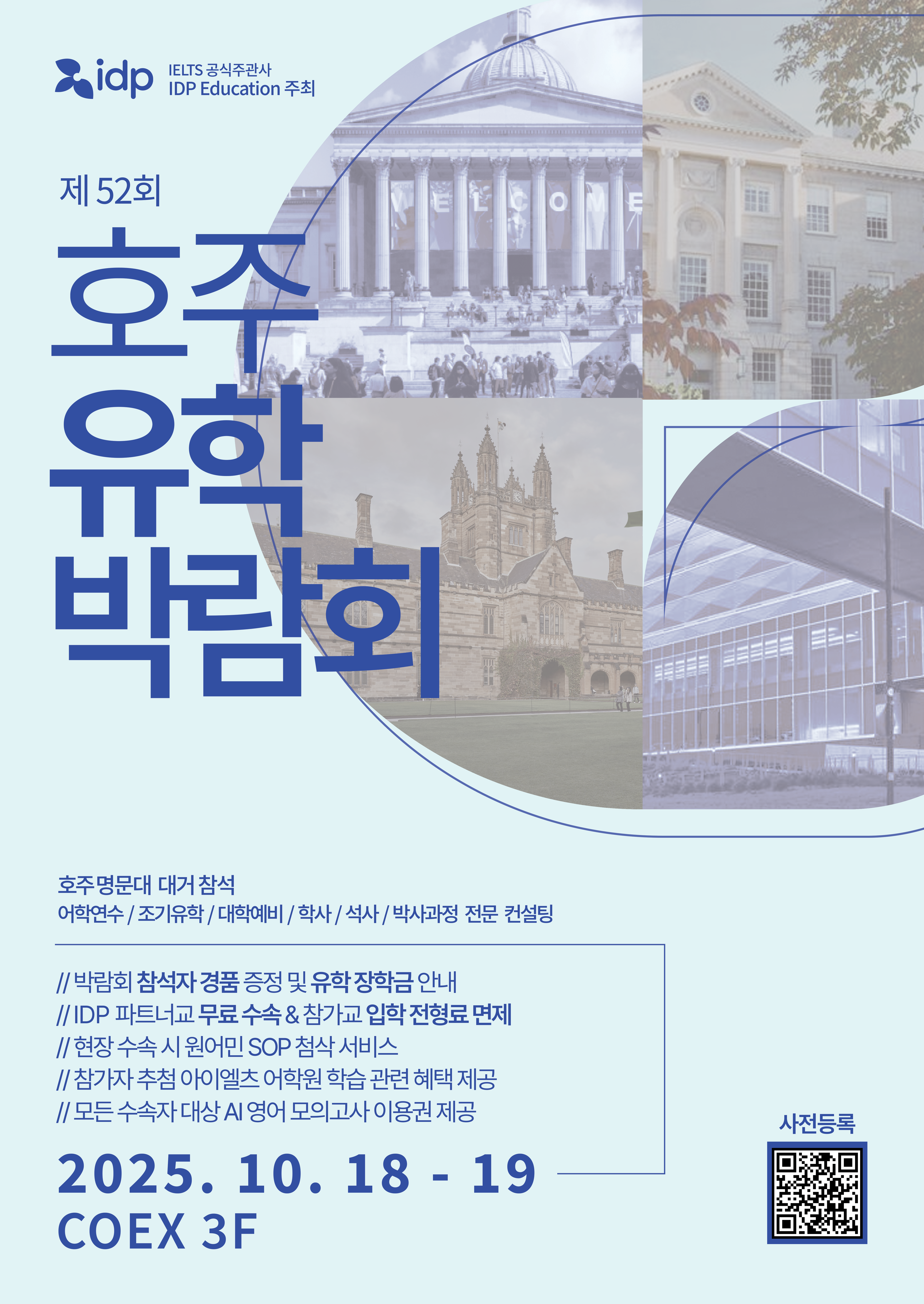 @ 사전신청 및 자세히보기 : https://www.idp.com/korea/study-in-australia/study-abroad-fair/