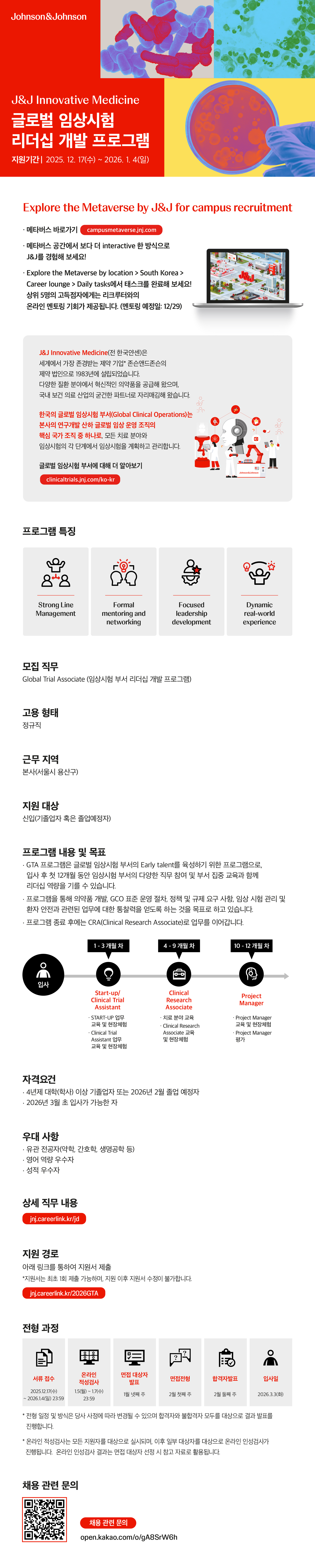 - 신청방법: Johnson&Johnson 채용 홈페이지를 통한 온라인 지원(https://jnj.careerlink.kr/2026GTA)