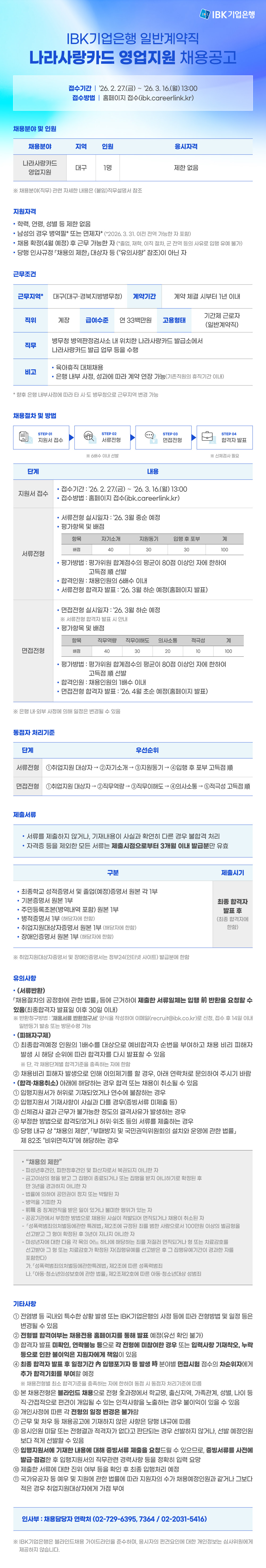 IBK기업은행에서 2026년 일반계약직 나라사랑카드 영업지원을 채용하고 있습니다.