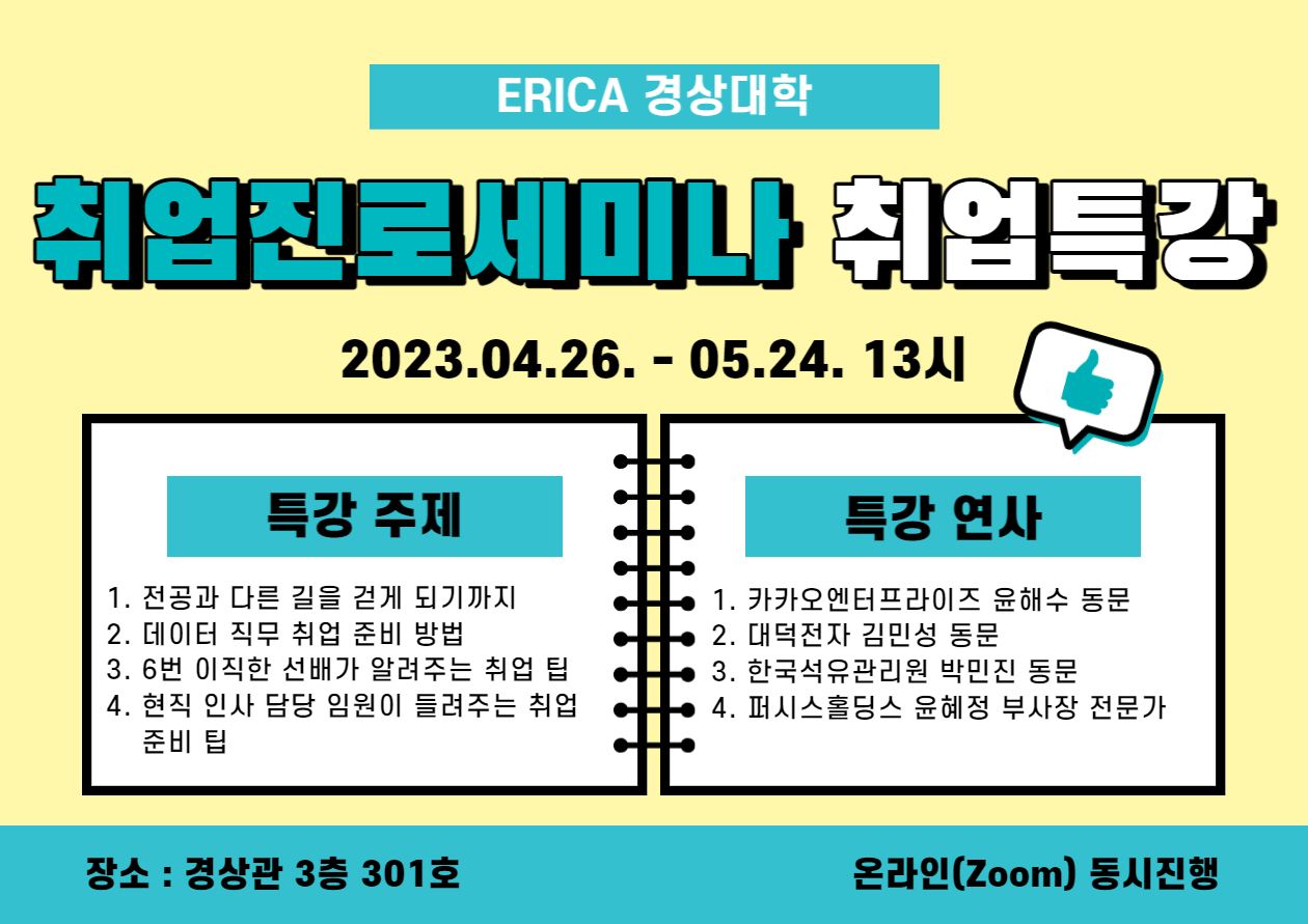 2023학년도 1학기 취업진로세미나 과목을 수강 중인 경제학부, 경영학부, 보험계리학과 학생들을 대상으로 한 선배 및 전문가 초청 특강 일정입니다.